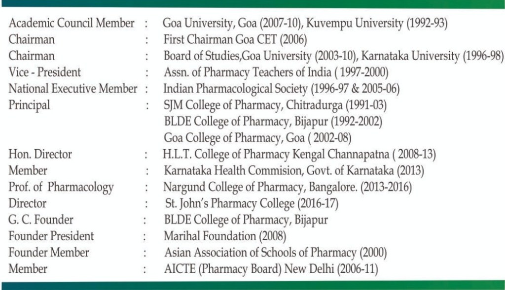 Prof. Dr. Subhas C. Marihal has an experience of 41 years in technical and medical [pharmaceutical] teaching, research, administration, as a professor, Principal and Director at various institutes including KLE Society, Medical and Pharmaceutical College and BLDE College of Pharmacy. These Institutions are recognized as Deemed Universities. He also worked as a Principal at one of the oldest college’s of Pharmacy in Asia and the eastern part of the world. Goa Public Service Commission selected him and he got appointed by the Government of Goa Portuguese established Pharmacy College in 1842, November 8, at Panaji, Goa. In year 2002, he joined as a first full time principal on 22 November 2002.